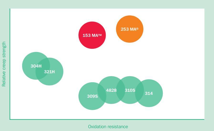 注:Oxidation resistance=抗氧化能力;Relative creep strength=相对蠕变强度。