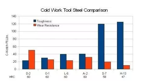 从硬度、耐磨及韧性三个指标(见下图)来看,S7的性能介于A2和H13之间,可弥补此二者之不足。