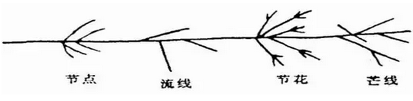 流线上明亮而又较粗的点称为节点。火花在爆裂时,产生的若干短线条称为芒线。芒线所组成的火花称为节花。