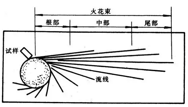 当钢样在砂轮上磨削时,高温的微细金属颗粒沿砂轮旋转的切线方向被抛射,之后同空气摩擦,温度继续升高,颗粒发生激烈的氧化和熔化,因而在运行中呈现出一条条光亮的流线。