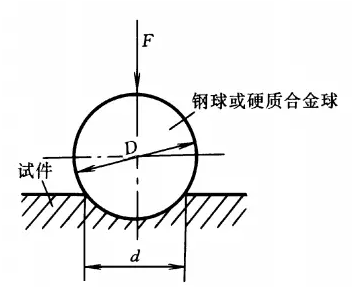 用直径D的淬火钢球或硬质合金球作压头,以相应的试验力F压入试件表面,经规定的保持时间后,卸除试验力,得到一直径为d的压痕。用试验力除以压痕表面积,所得值即为布氏硬度值,符号用HBS或HBW表示。