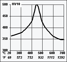 硬度/温度在1040°C(1904°F)奥氏体化30分钟后回火4小时,淬火100°C/秒(212°F/秒)。