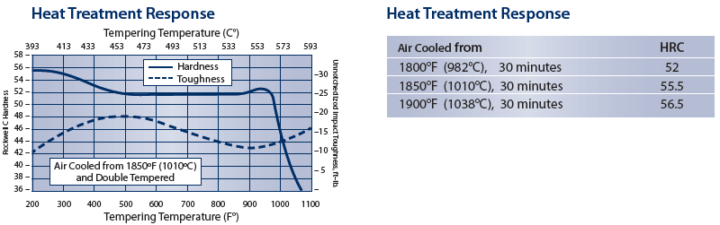 预热:为了最大限度地减少复杂工具的变形,请使用双预热。加热速度不超过每小时400º(每小时222ºC)至1150-1250ºF(621-677ºC),均衡,然后升至1400-1500ºF(760-816ºC)并均衡。对于普通工具,仅使用第二温度作为单一预热处理。